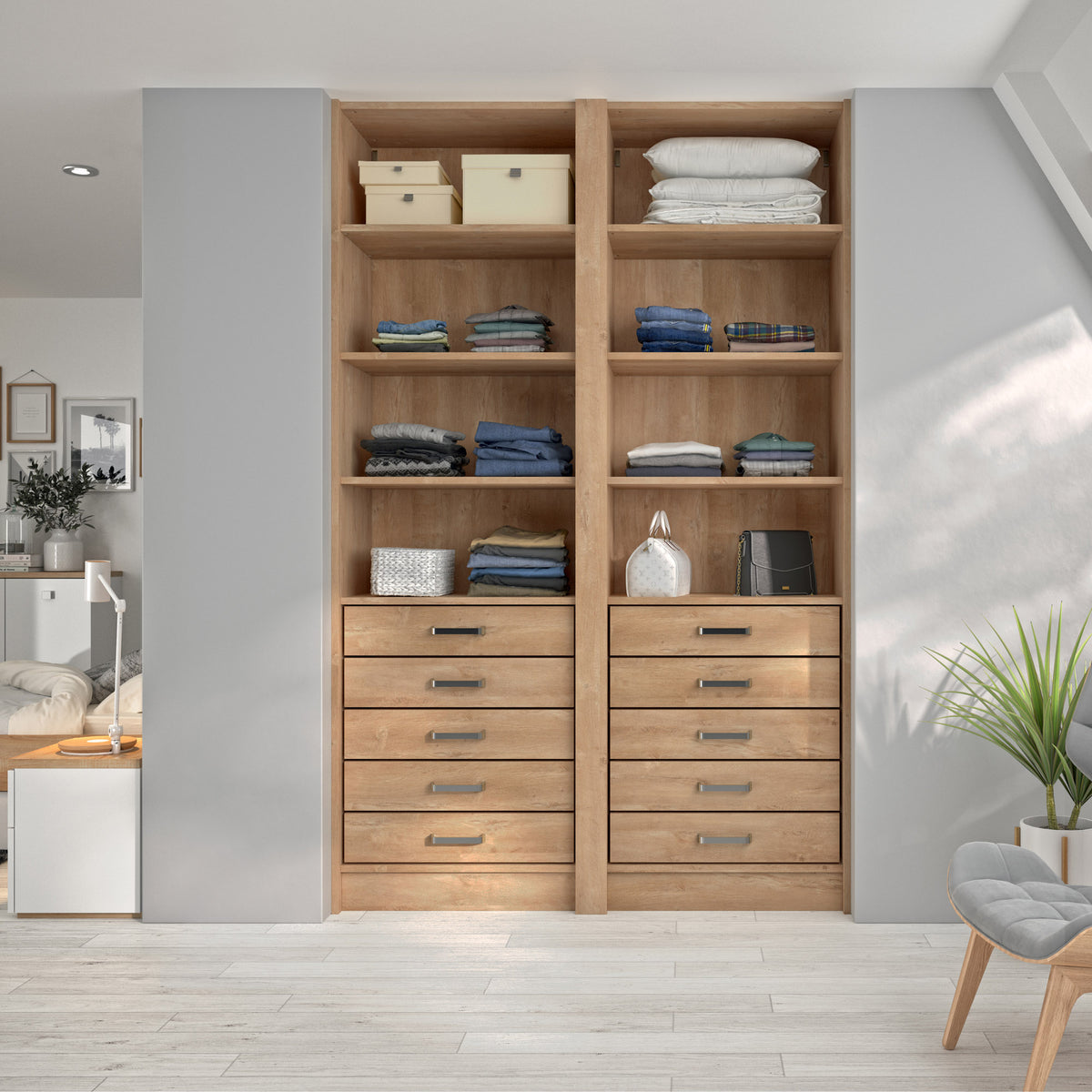 Ce dressing Chêne Blond de 2 espaces est composé (), de 8 étagères de rangement (idéales pour les vêtements pliés, comme les t-shirts et les pulls), et d'un tiroir simple (pour accueillir les accessoires et les ceintures).