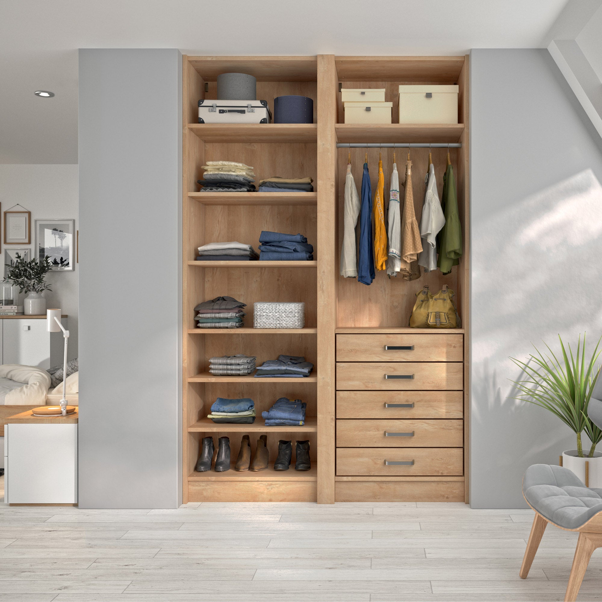 Ce dressing Chêne Blond de 2 espaces est composé d'une tringle (1 penderie courte pour les vêtements de type chemises, vestes), de 8 étagères de rangement (idéales pour les vêtements pliés, comme les t-shirts et les pulls), et de six tiroirs simples (pour accueillir les accessoires et les ceintures).