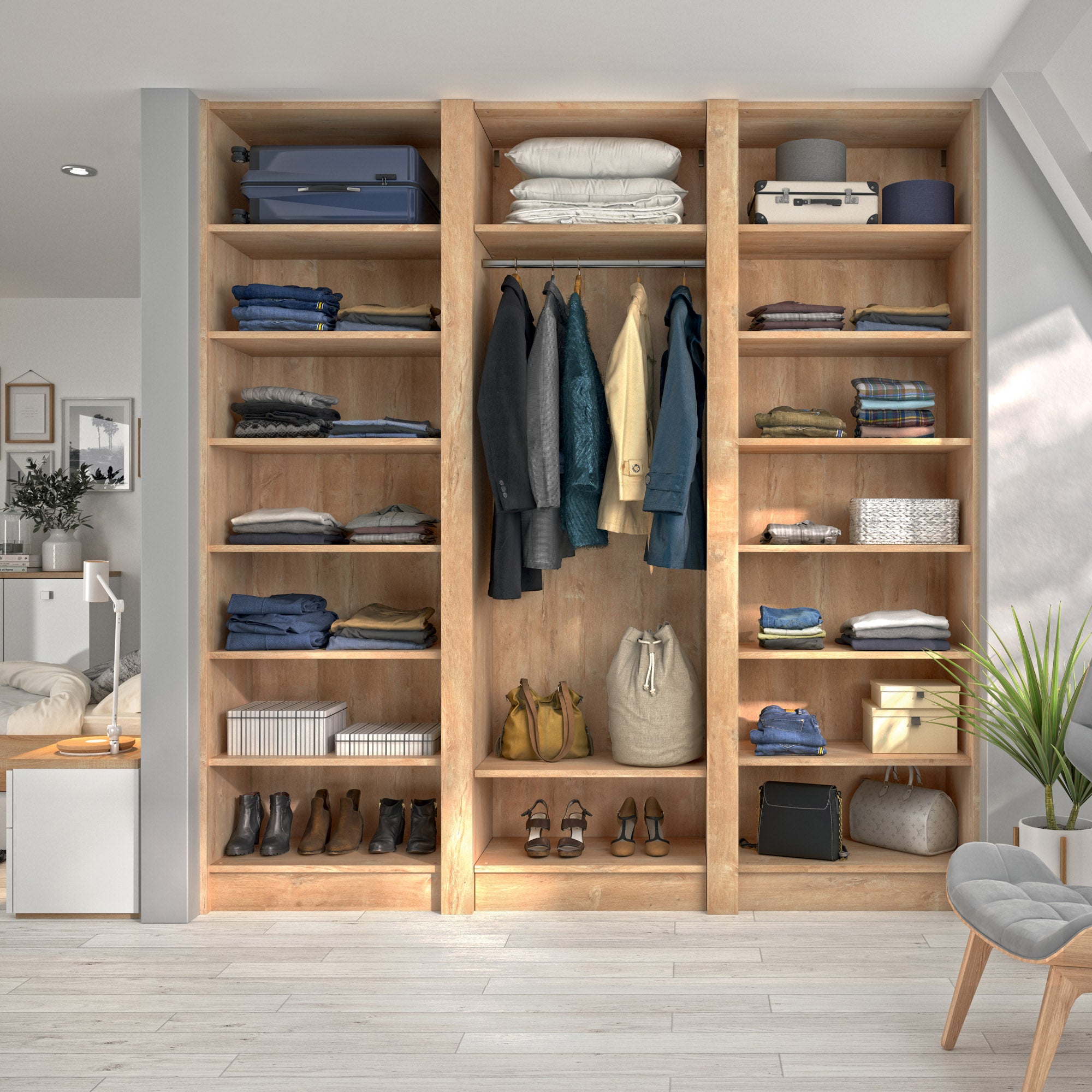 Les points forts : Fabriqué à vos dimensions. Epaisseur de la structure 22 mm, fond de 8 mm monté en rainure pour une rigidité parfaite. Des pieds de réglages permettent le bon ajustement de votre dressing. Konsilio est parfaitement adapté à une installation avec ou sans portes de placard Kazed.