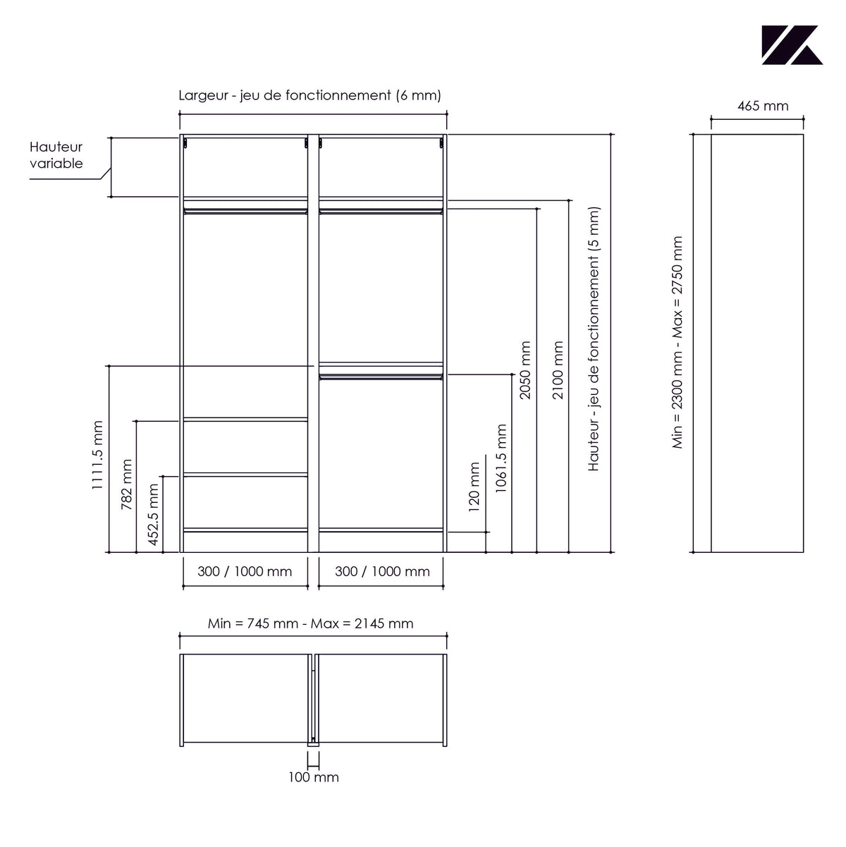 Les points forts : Fabriqué à vos dimensions. Epaisseur de la structure 22 mm, fond de 8 mm monté en rainure pour une rigidité parfaite. Des pieds de réglages permettent le bon ajustement de votre dressing. Konsilio est parfaitement adapté à une installation avec ou sans portes de placard Kazed.