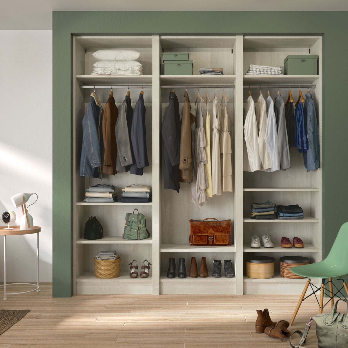 Les points forts : Fabriqué à vos dimensions. Epaisseur de la structure 22 mm, fond de 8 mm monté en rainure pour une rigidité parfaite. Des pieds de réglages permettent le bon ajustement de votre dressing. Konsilio est parfaitement adapté à une installation avec ou sans portes de placard Kazed.