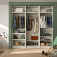 Ce dressing Bois Flotté Crème de 3 espaces est composé de trois tringles (1 penderie longue pour les robes et manteaux et 2 penderies courtes pour les vêtements de type chemises, vestes) et de 9 étagères de rangement (idéales pour les vêtements pliés, comme les t-shirts et les pulls).