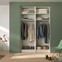 Ce dressing Bois Flotté Crème de 2 espaces est composé de deux tringles (2 penderies longues pour les robes et manteaux) et de 4 étagères de rangement (idéales pour les vêtements pliés, comme les t-shirts et les pulls).