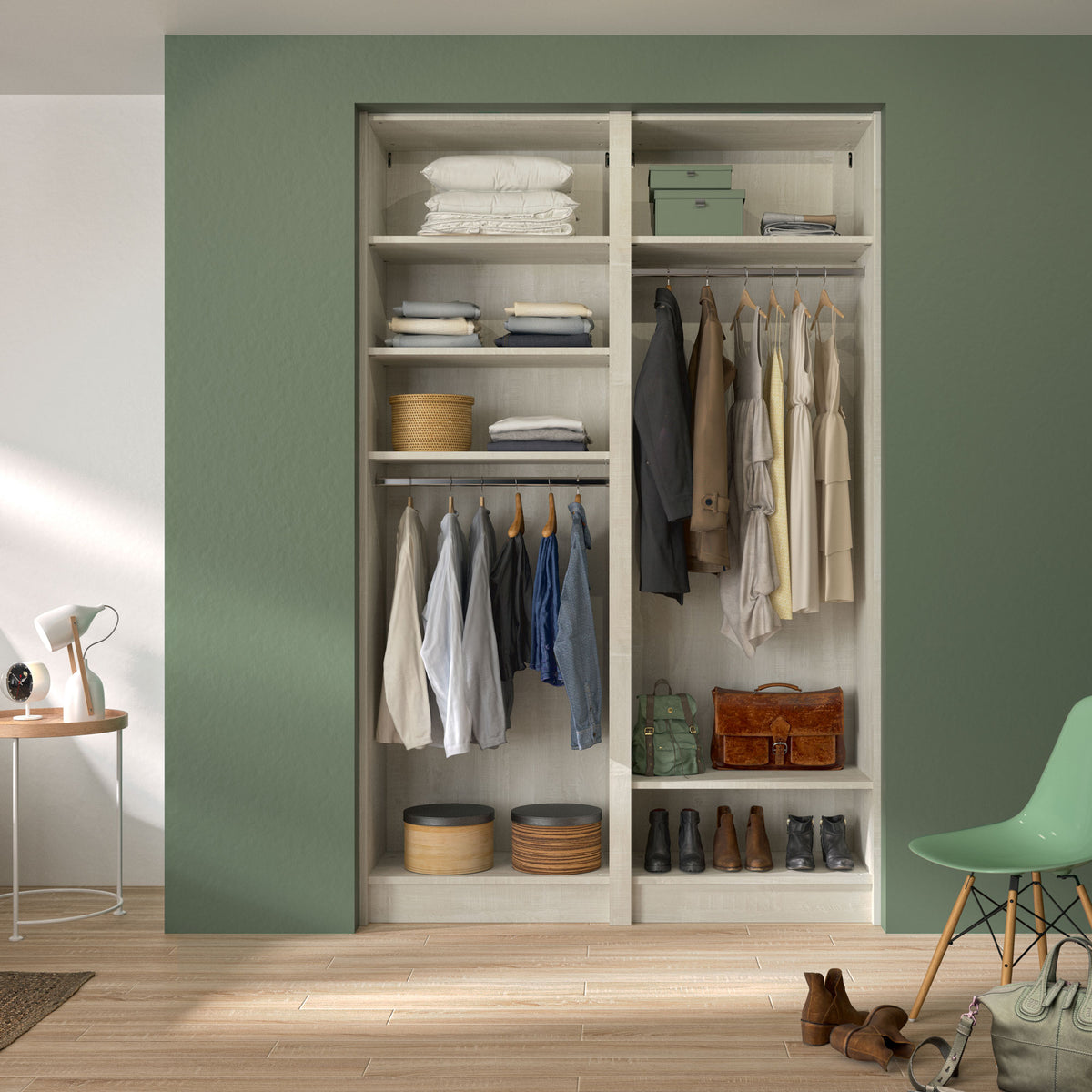 Ce dressing Bois Flotté Crème de 2 espaces est composé de deux tringles (1 penderie longue pour les robes et manteaux et 1 penderie courte pour les vêtements de type chemises, vestes) et de 5 étagères de rangement (idéales pour les vêtements pliés, comme les t-shirts et les pulls).