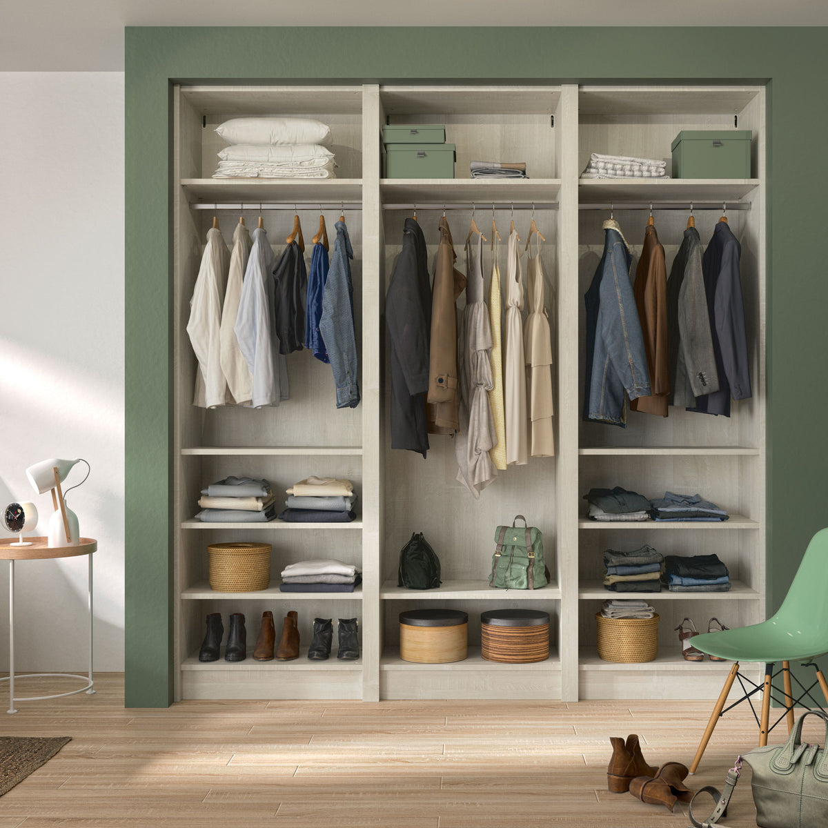 Les points forts : Fabriqué à vos dimensions. Epaisseur de la structure 22 mm, fond de 8 mm monté en rainure pour une rigidité parfaite. Des pieds de réglages permettent le bon ajustement de votre dressing. Konsilio est parfaitement adapté à une installation avec ou sans portes de placard Kazed.
