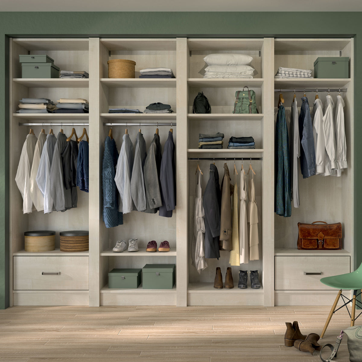Parfaitement compatibles avec nos façades de placard coulissantes 4 vantaux, les nouvelles compositions Konsilio 4 espaces apportent de nombreuses solutions de rangement. Elles sont idéales pour les dressings grandes dimensions !