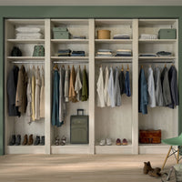 Ce dressing Bois Flotté Crème de 4 espaces est composé de quatre tringles (4 penderies longues pour les robes et manteaux) et de 8 étagères de rangement (idéales pour les vêtements pliés, comme les t-shirts et les pulls).