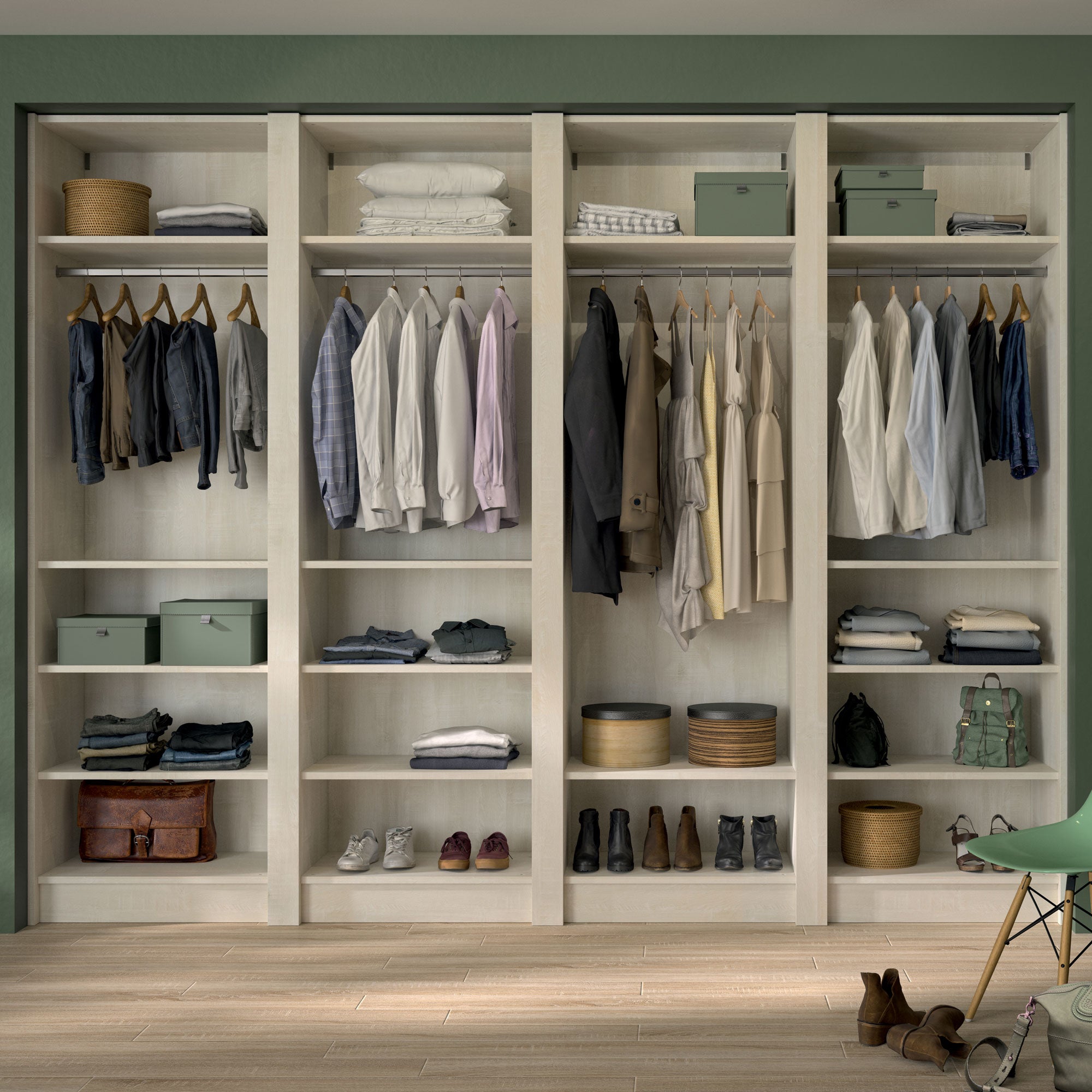 Parfaitement compatibles avec nos façades de placard coulissantes 4 vantaux, les nouvelles compositions Konsilio 4 espaces apportent de nombreuses solutions de rangement. Elles sont idéales pour les dressings grandes dimensions !