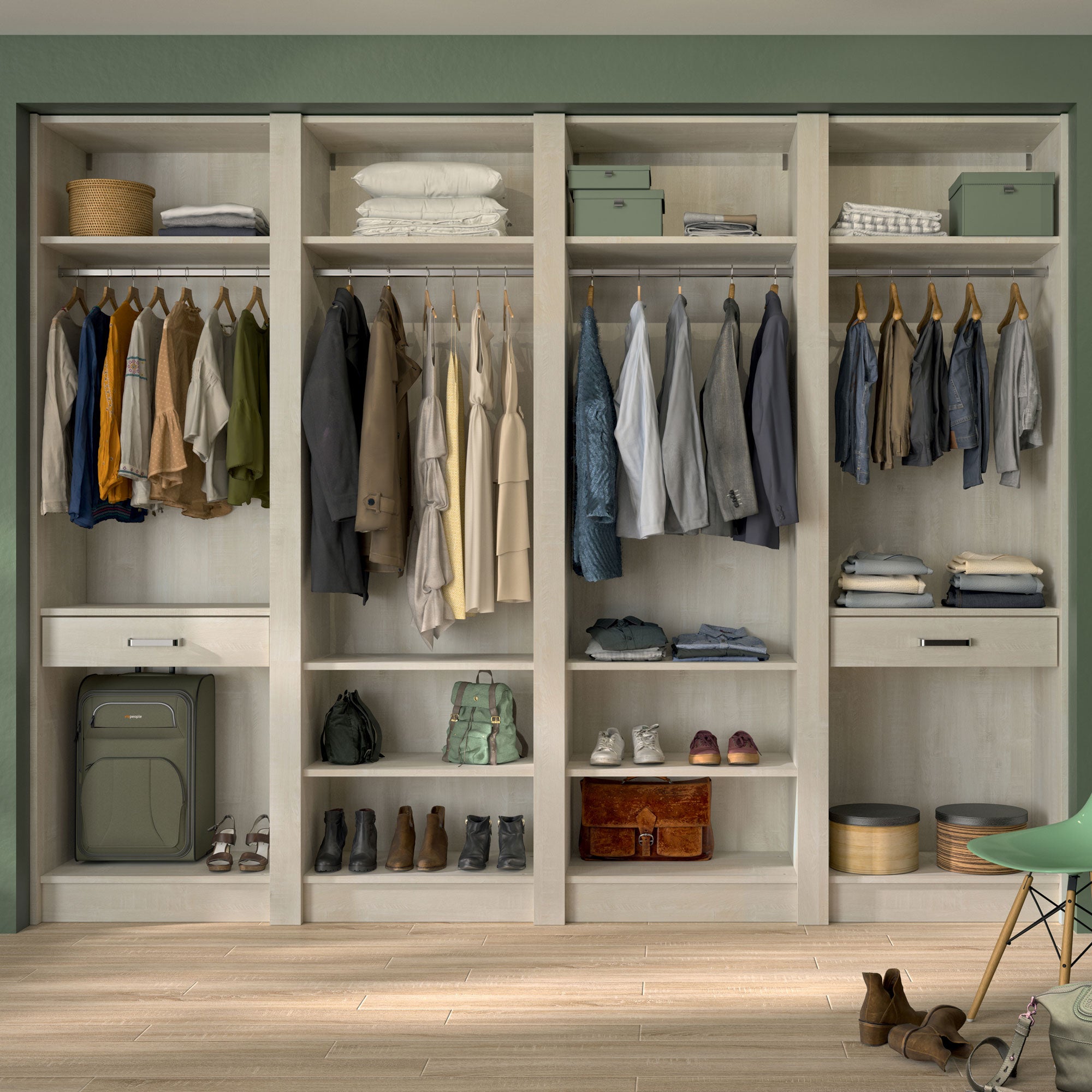 Ce dressing Bois Flotté Crème de 4 espaces est composé de quatre tringles (2 penderies longues pour les robes et manteaux et 2 penderies courtes pour les vêtements de type chemises, vestes), de 10 étagères de rangement (idéales pour les vêtements pliés, comme les t-shirts et les pulls), et de deux tiroirs simples (pour accueillir les accessoires et les ceintures).