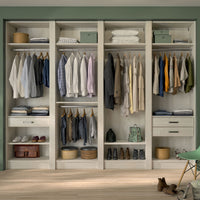 Ce dressing Bois Flotté Crème de 4 espaces est composé de cinq tringles (2 penderies longues pour les robes et manteaux et 4 penderies courtes pour les vêtements de type chemises, vestes), de 9 étagères de rangement (idéales pour les vêtements pliés, comme les t-shirts et les pulls), et de trois tiroirs simples (pour accueillir les accessoires et les ceintures).