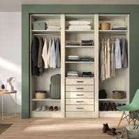 Ce dressing Bois Flotté Crème de 3 espaces est composé de deux tringles (2 penderies longues pour les robes et manteaux), de 8 étagères de rangement (idéales pour les vêtements pliés, comme les t-shirts et les pulls), et de cinq tiroirs simples (pour accueillir les accessoires et les ceintures).