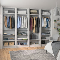 Ce dressing Gris Galet de 4 espaces est composé de quatre tringles (1 penderie longue pour les robes et manteaux et 3 penderies courtes pour les vêtements de type chemises, vestes) et de 14 étagères de rangement (idéales pour les vêtements pliés, comme les t-shirts et les pulls).