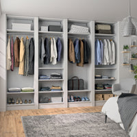 Ce dressing Gris Galet de 4 espaces est composé de quatre tringles (2 penderies longues pour les robes et manteaux et 2 penderies courtes pour les vêtements de type chemises, vestes) et de 12 étagères de rangement (idéales pour les vêtements pliés, comme les t-shirts et les pulls).