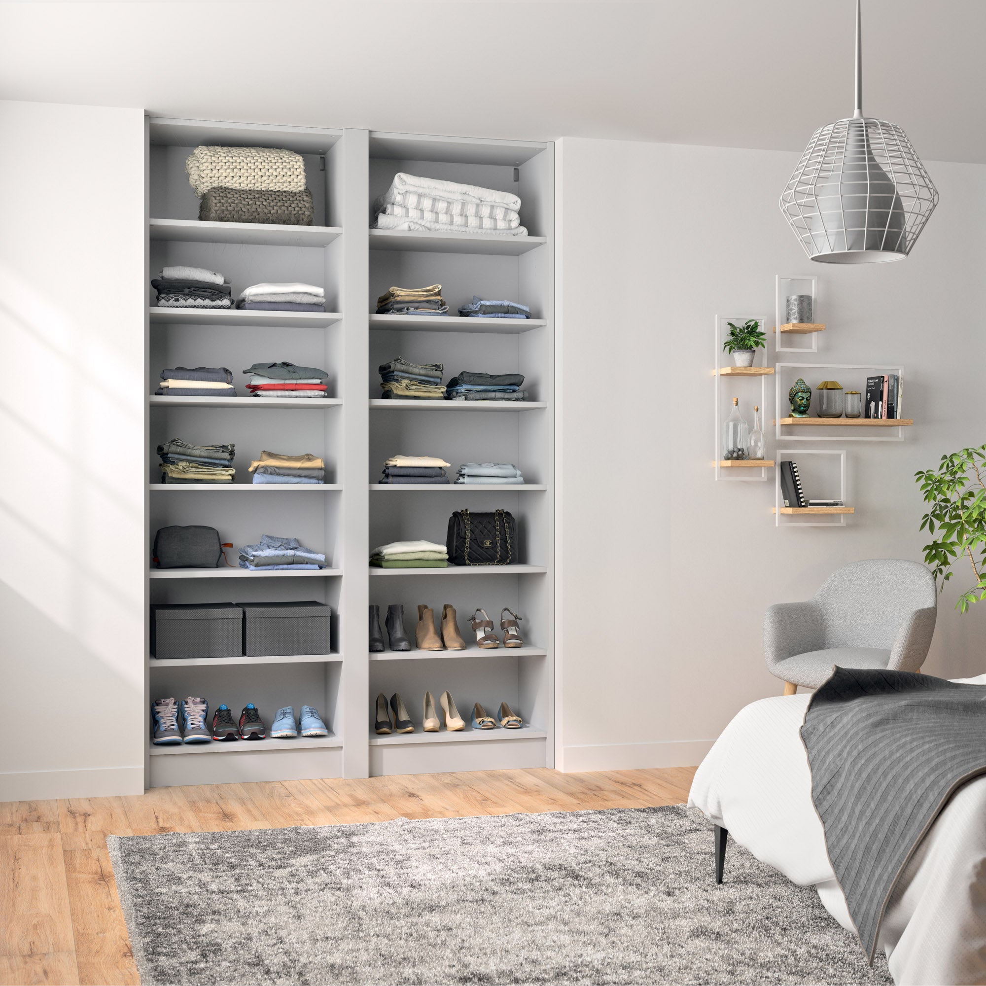 Ce dressing Gris Galet de 2 espaces est composé () et de 12 étagères de rangement (idéales pour les vêtements pliés, comme les t-shirts et les pulls).
