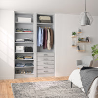 Ce dressing Gris Galet de 2 espaces est composé d'une tringle (1 penderie courte pour les vêtements de type chemises, vestes), de 8 étagères de rangement (idéales pour les vêtements pliés, comme les t-shirts et les pulls), et de cinq tiroirs simples (pour accueillir les accessoires et les ceintures).