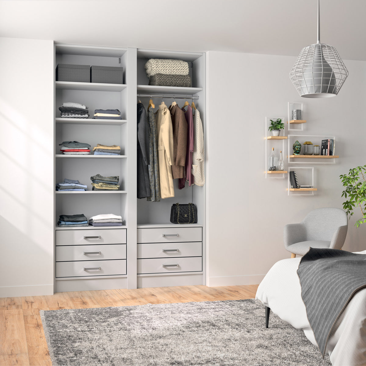 Ce dressing Gris Galet de 2 espaces est composé d'une tringle (1 penderie longue pour les robes et manteaux), de 7 étagères de rangement (idéales pour les vêtements pliés, comme les t-shirts et les pulls), et de dix tiroirs simples (pour accueillir les accessoires et les ceintures).