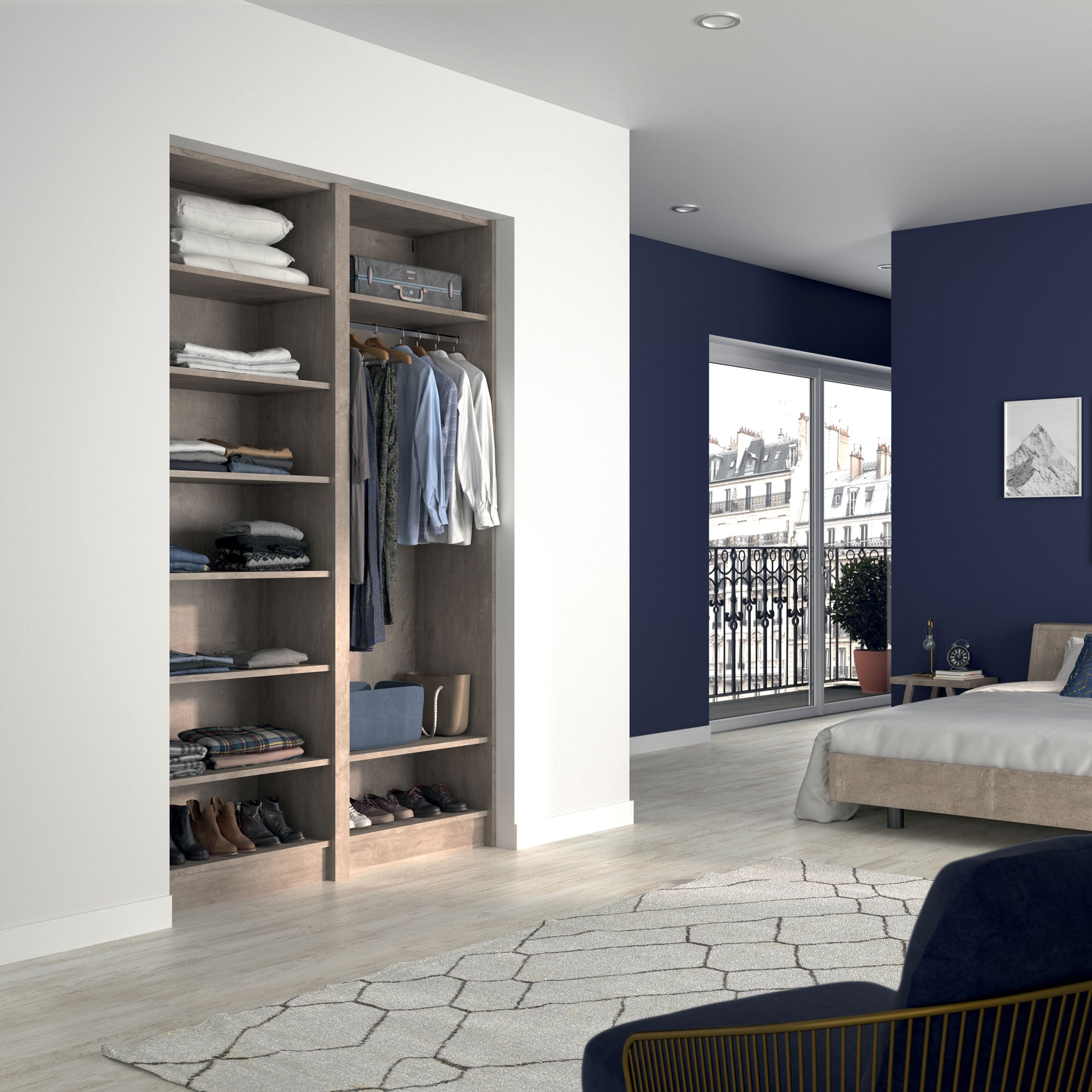 Ce dressing Chêne Cigare Brut de 2 espaces est composé d'une tringle (1 penderie longue pour les robes et manteaux) et de 8 étagères de rangement (idéales pour les vêtements pliés, comme les t-shirts et les pulls).