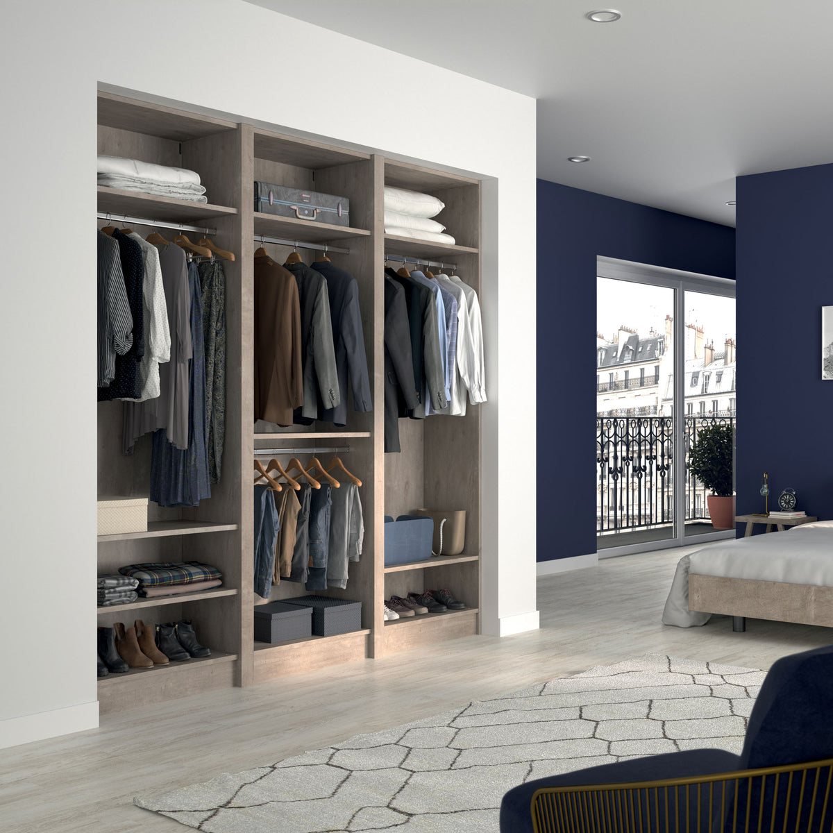 Ce dressing Chêne Cigare Brut de 3 espaces est composé de quatre tringles (2 penderies longues pour les robes et manteaux et 2 penderies courtes pour les vêtements de type chemises, vestes) et de 7 étagères de rangement (idéales pour les vêtements pliés, comme les t-shirts et les pulls).