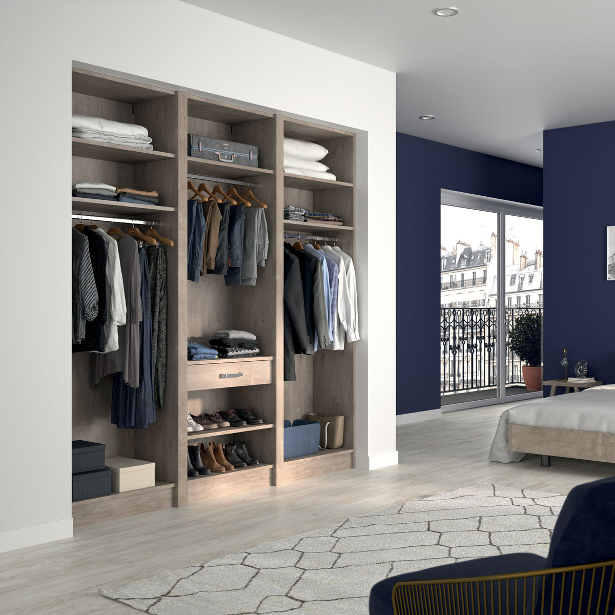 Ce dressing Chêne Cigare Brut de 3 espaces est composé de trois tringles (2 penderies longues pour les robes et manteaux et 1 penderie courte pour les vêtements de type chemises, vestes), de 7 étagères de rangement (idéales pour les vêtements pliés, comme les t-shirts et les pulls), et d'un tiroir simple (pour accueillir les accessoires et les ceintures).