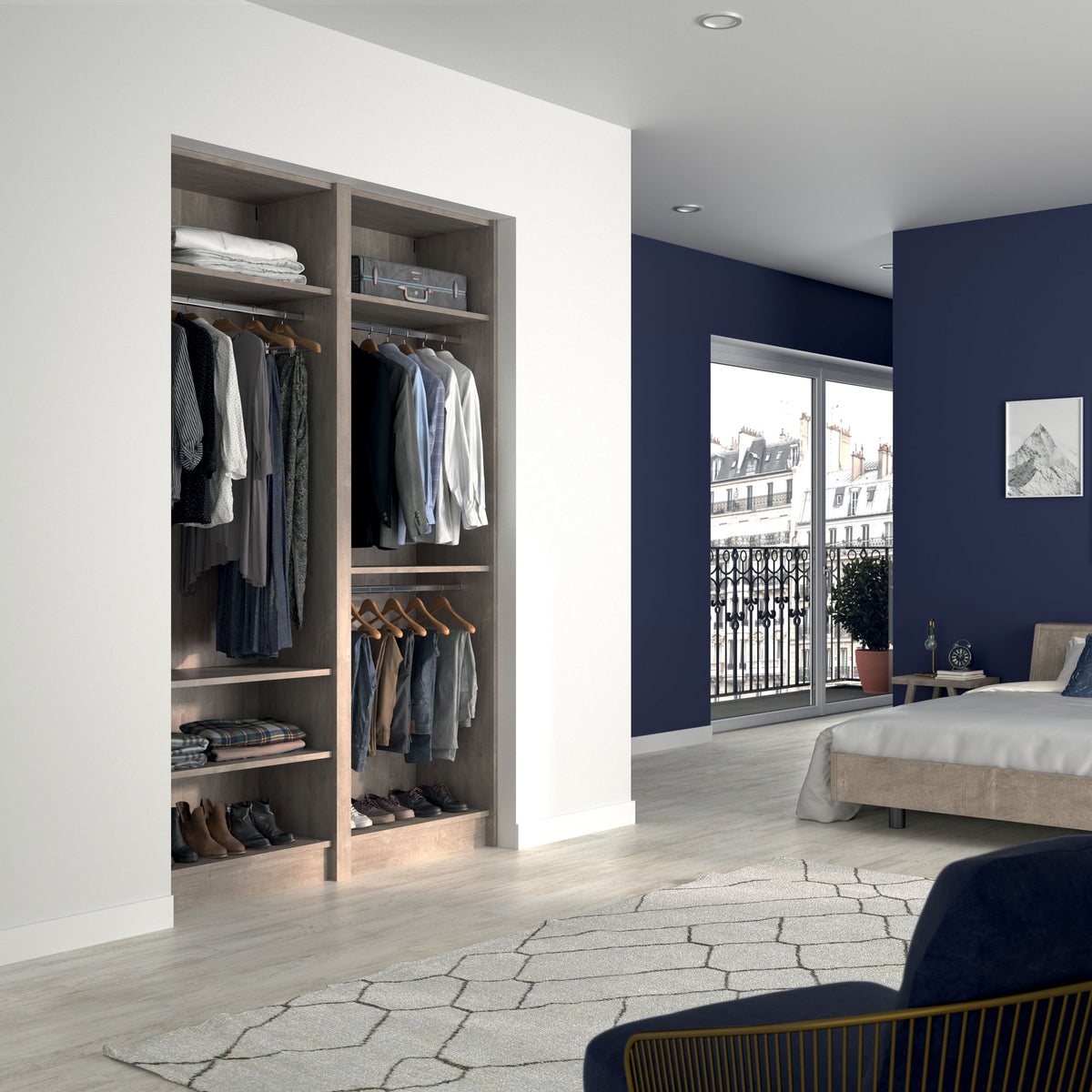 Ce dressing Chêne Cigare Brut de 2 espaces est composé de trois tringles (1 penderie longue pour les robes et manteaux et 2 penderies courtes pour les vêtements de type chemises, vestes) et de 5 étagères de rangement (idéales pour les vêtements pliés, comme les t-shirts et les pulls).