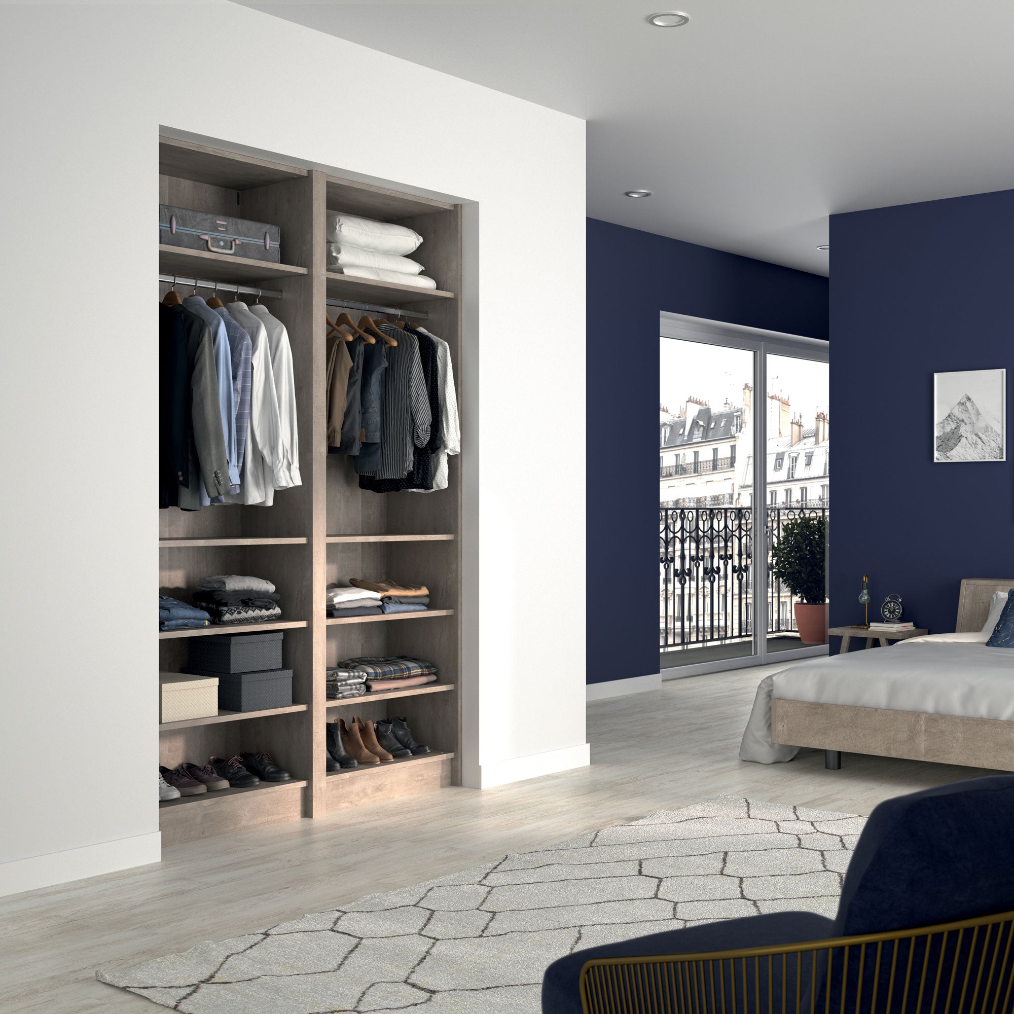 Ce dressing Chêne Cigare Brut de 2 espaces est composé de deux tringles (2 penderies courtes pour les vêtements de type chemises, vestes) et de 8 étagères de rangement (idéales pour les vêtements pliés, comme les t-shirts et les pulls).