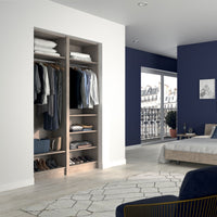 Ce dressing Chêne Cigare Brut de 2 espaces est composé de deux tringles (1 penderie longue pour les robes et manteaux et 1 penderie courte pour les vêtements de type chemises, vestes) et de 6 étagères de rangement (idéales pour les vêtements pliés, comme les t-shirts et les pulls).