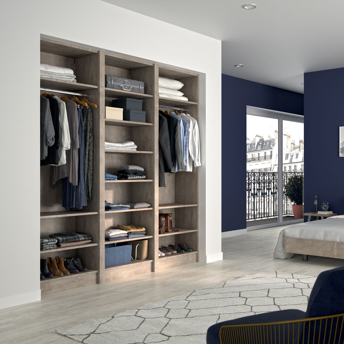 Ce dressing Chêne Cigare Brut de 3 espaces est composé de deux tringles (2 penderies longues pour les robes et manteaux) et de 12 étagères de rangement (idéales pour les vêtements pliés, comme les t-shirts et les pulls).