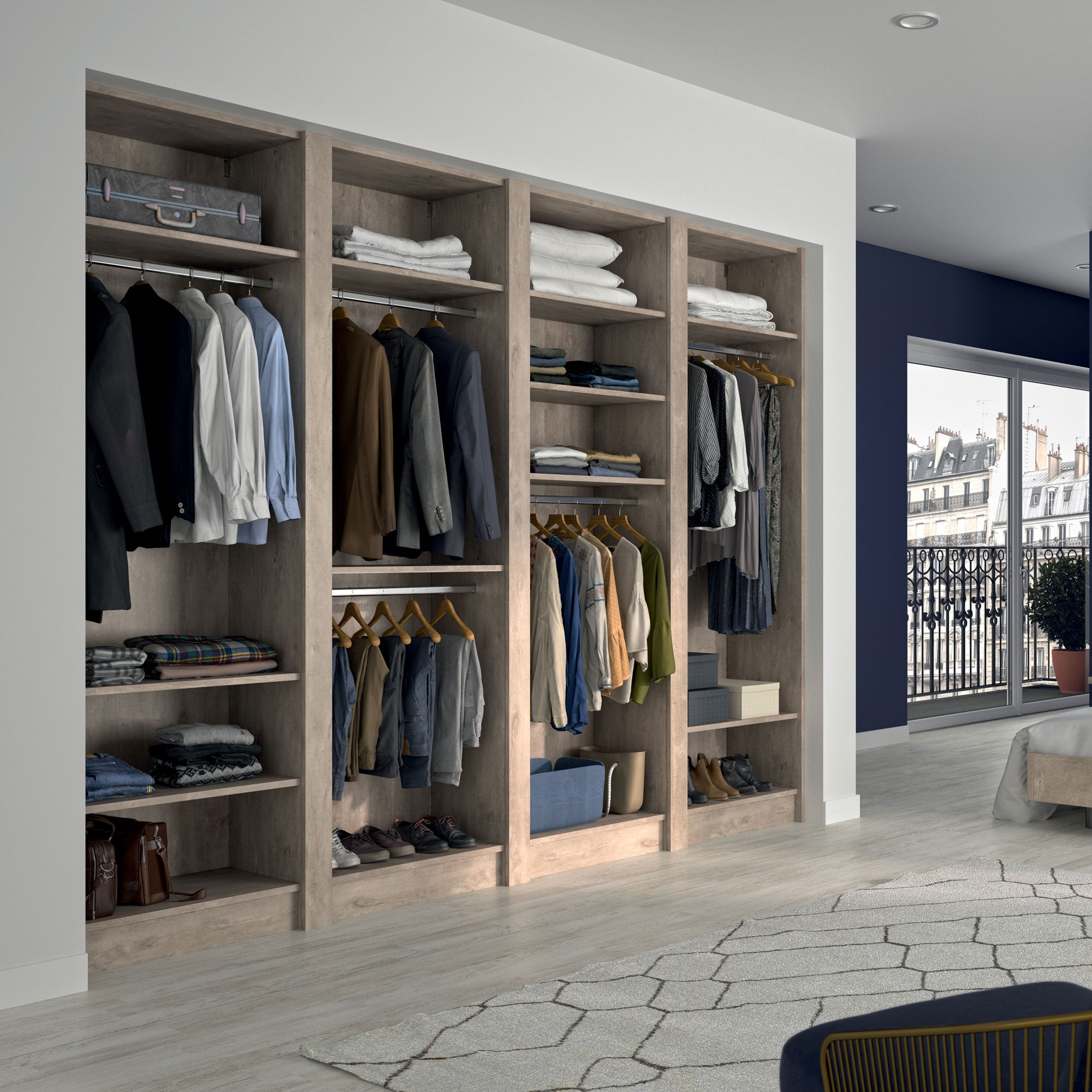 Ce dressing Chêne Cigare Brut de 4 espaces est composé de cinq tringles (2 penderies longues pour les robes et manteaux et 3 penderies courtes pour les vêtements de type chemises, vestes) et de 10 étagères de rangement (idéales pour les vêtements pliés, comme les t-shirts et les pulls).
