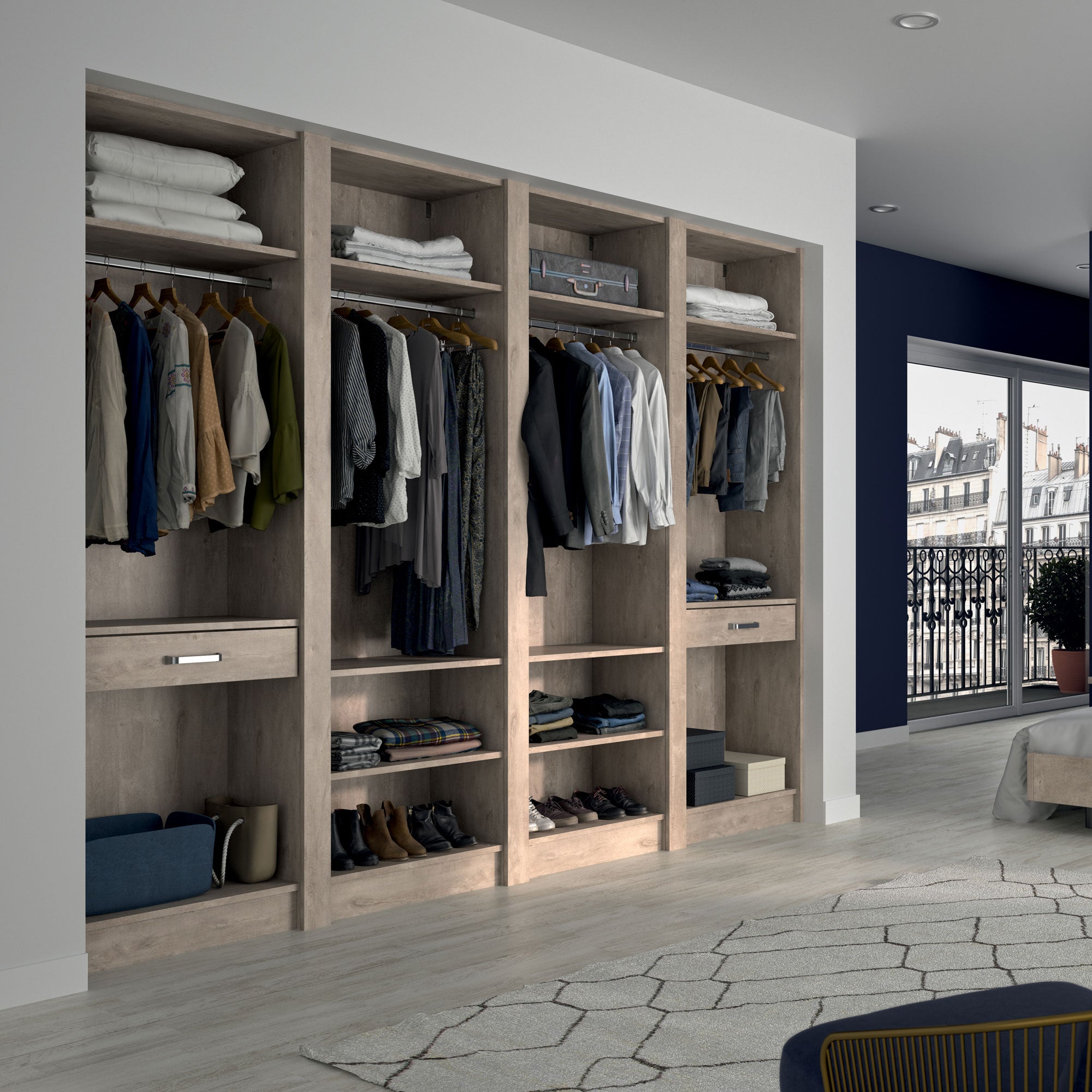 Ce dressing Chêne Cigare Brut de 4 espaces est composé de quatre tringles (2 penderies longues pour les robes et manteaux et 2 penderies courtes pour les vêtements de type chemises, vestes), de 10 étagères de rangement (idéales pour les vêtements pliés, comme les t-shirts et les pulls), et de deux tiroirs simples (pour accueillir les accessoires et les ceintures).