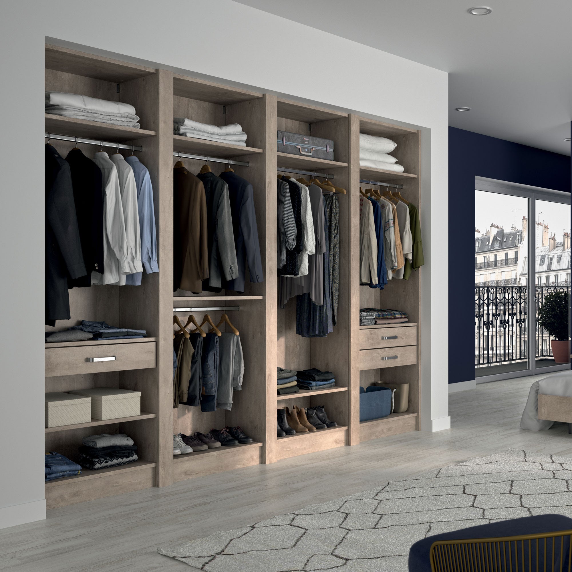 Ce dressing Chêne Cigare Brut de 4 espaces est composé de cinq tringles (2 penderies longues pour les robes et manteaux et 4 penderies courtes pour les vêtements de type chemises, vestes), de 9 étagères de rangement (idéales pour les vêtements pliés, comme les t-shirts et les pulls), et de trois tiroirs simples (pour accueillir les accessoires et les ceintures).