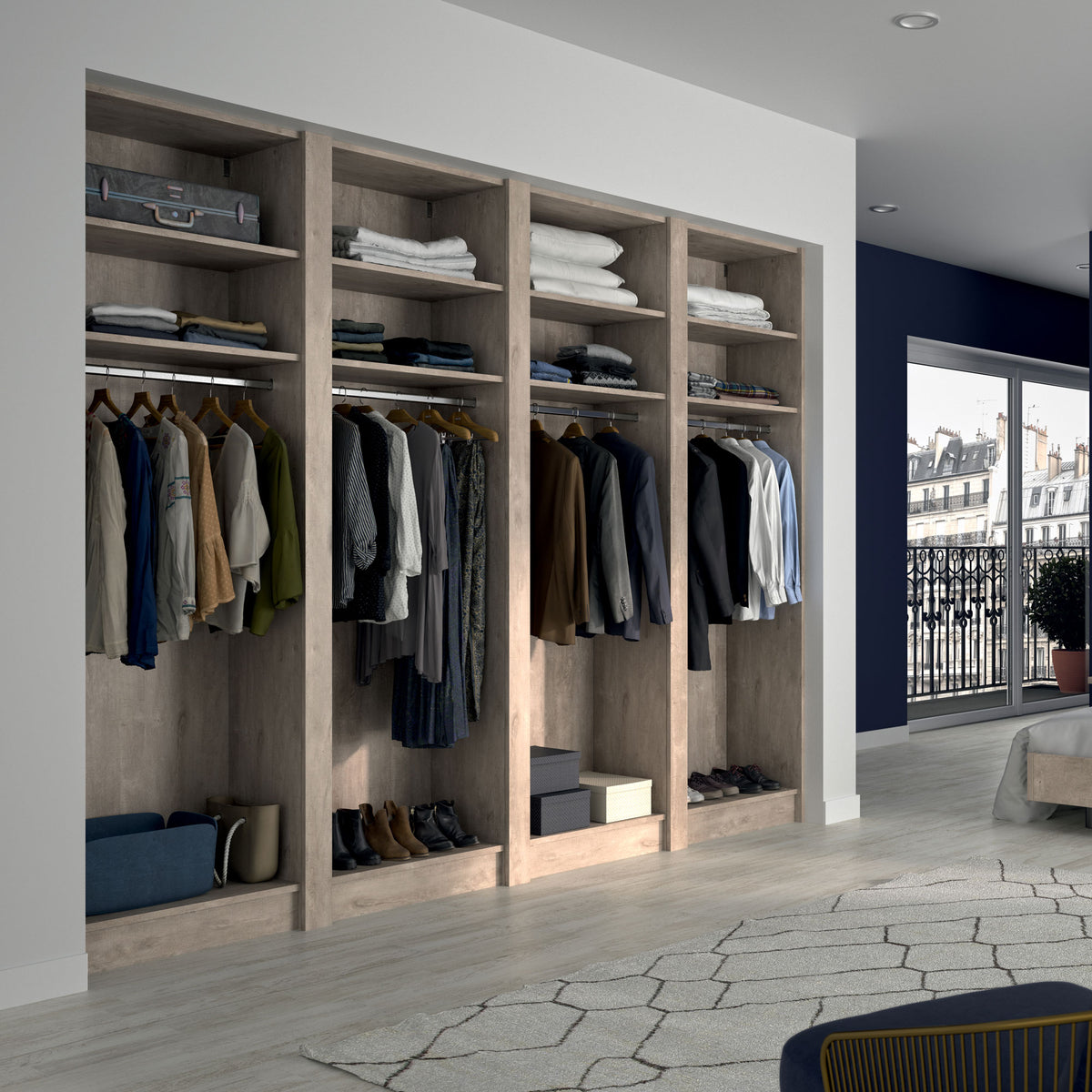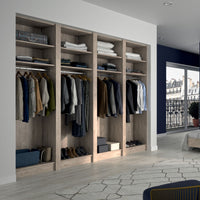 Ce dressing Chêne Cigare Brut de 4 espaces est composé de quatre tringles (4 penderies longues pour les robes et manteaux) et de 8 étagères de rangement (idéales pour les vêtements pliés, comme les t-shirts et les pulls).