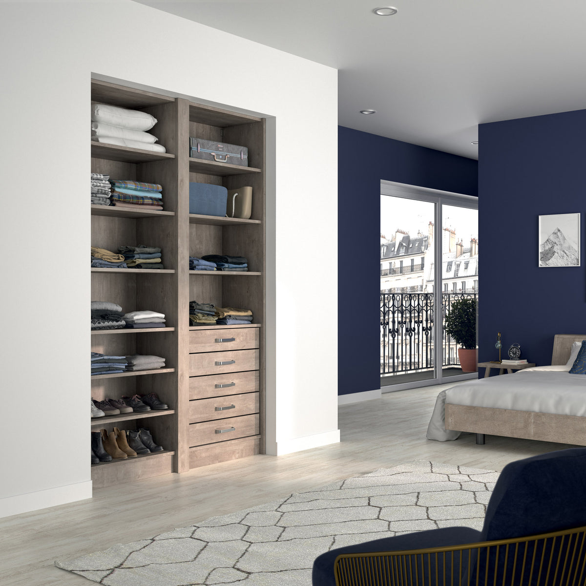 Ce dressing Chêne Cigare Brut de 2 espaces est composé (), de 10 étagères de rangement (idéales pour les vêtements pliés, comme les t-shirts et les pulls), et de cinq tiroirs simples (pour accueillir les accessoires et les ceintures).