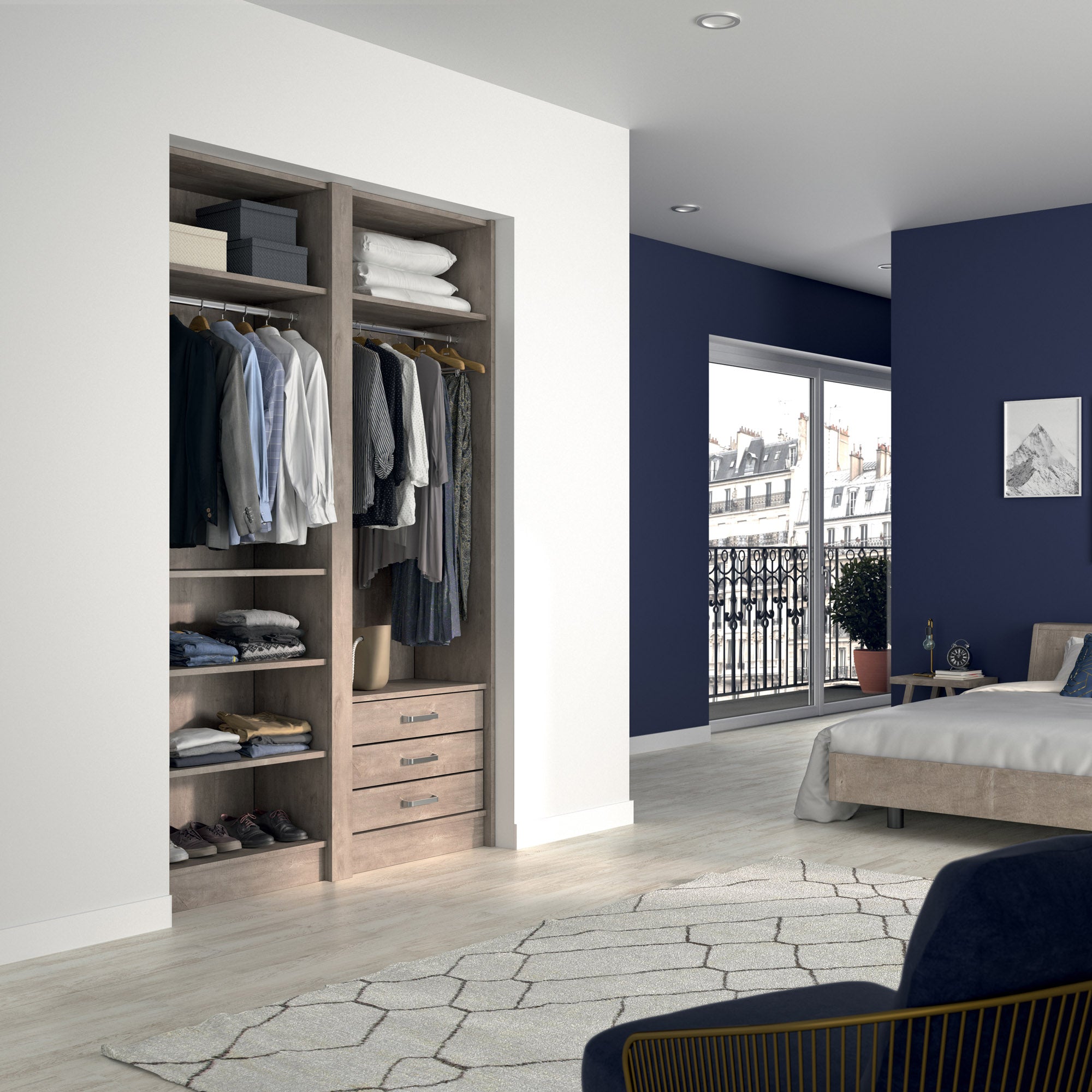 Les points forts : Fabriqué à vos dimensions. Epaisseur de la structure 22 mm, fond de 8 mm monté en rainure pour une rigidité parfaite. Des pieds de réglages permettent le bon ajustement de votre dressing. Konsilio est parfaitement adapté à une installation avec ou sans portes de placard Kazed.