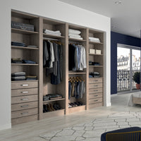 Ce dressing Chêne Cigare Brut de 4 espaces est composé de trois tringles (1 penderie longue pour les robes et manteaux et 2 penderies courtes pour les vêtements de type chemises, vestes), de 12 étagères de rangement (idéales pour les vêtements pliés, comme les t-shirts et les pulls), et de dix tiroirs simples (pour accueillir les accessoires et les ceintures).