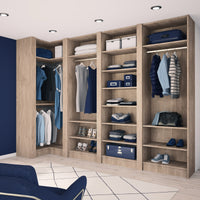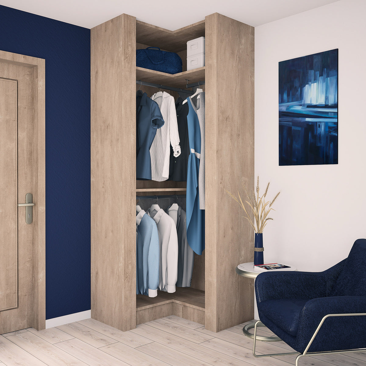 Ce dressing d'angle Chêne Cigare Brut 1 espace est composé de trois tringles : 1 penderie longue (pour robes, manteaux, etc.) et 2 courtes (pour chemises, vestes, etc.) et de 3 étagères.