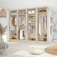 Ce dressing Châtaignier Clair de 4 espaces est composé de cinq tringles (2 penderies longues pour les robes et manteaux et 3 penderies courtes pour les vêtements de type chemises, vestes) et de 10 étagères de rangement (idéales pour les vêtements pliés, comme les t-shirts et les pulls).
