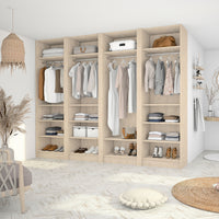 Ce dressing Châtaignier Clair de 4 espaces est composé de quatre tringles (1 penderie longue pour les robes et manteaux et 3 penderies courtes pour les vêtements de type chemises, vestes) et de 14 étagères de rangement (idéales pour les vêtements pliés, comme les t-shirts et les pulls).
