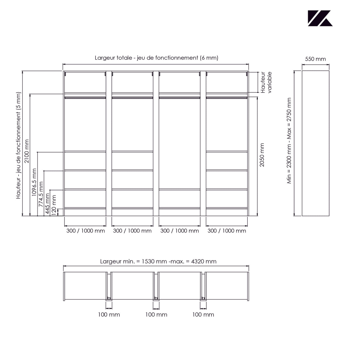 Parfaitement compatibles avec nos façades de placard coulissantes 4 vantaux, les nouvelles compositions Konsilio 4 espaces apportent de nombreuses solutions de rangement. Elles sont idéales pour les dressings grandes dimensions !