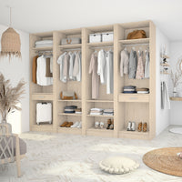 Ce dressing Châtaignier Clair de 4 espaces est composé de quatre tringles (2 penderies longues pour les robes et manteaux et 2 penderies courtes pour les vêtements de type chemises, vestes), de 10 étagères de rangement (idéales pour les vêtements pliés, comme les t-shirts et les pulls), et de deux tiroirs simples (pour accueillir les accessoires et les ceintures).