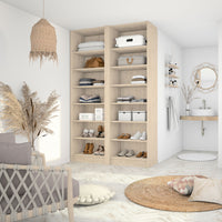 Ce dressing Châtaignier Clair de 2 espaces est composé () et de 12 étagères de rangement (idéales pour les vêtements pliés, comme les t-shirts et les pulls).