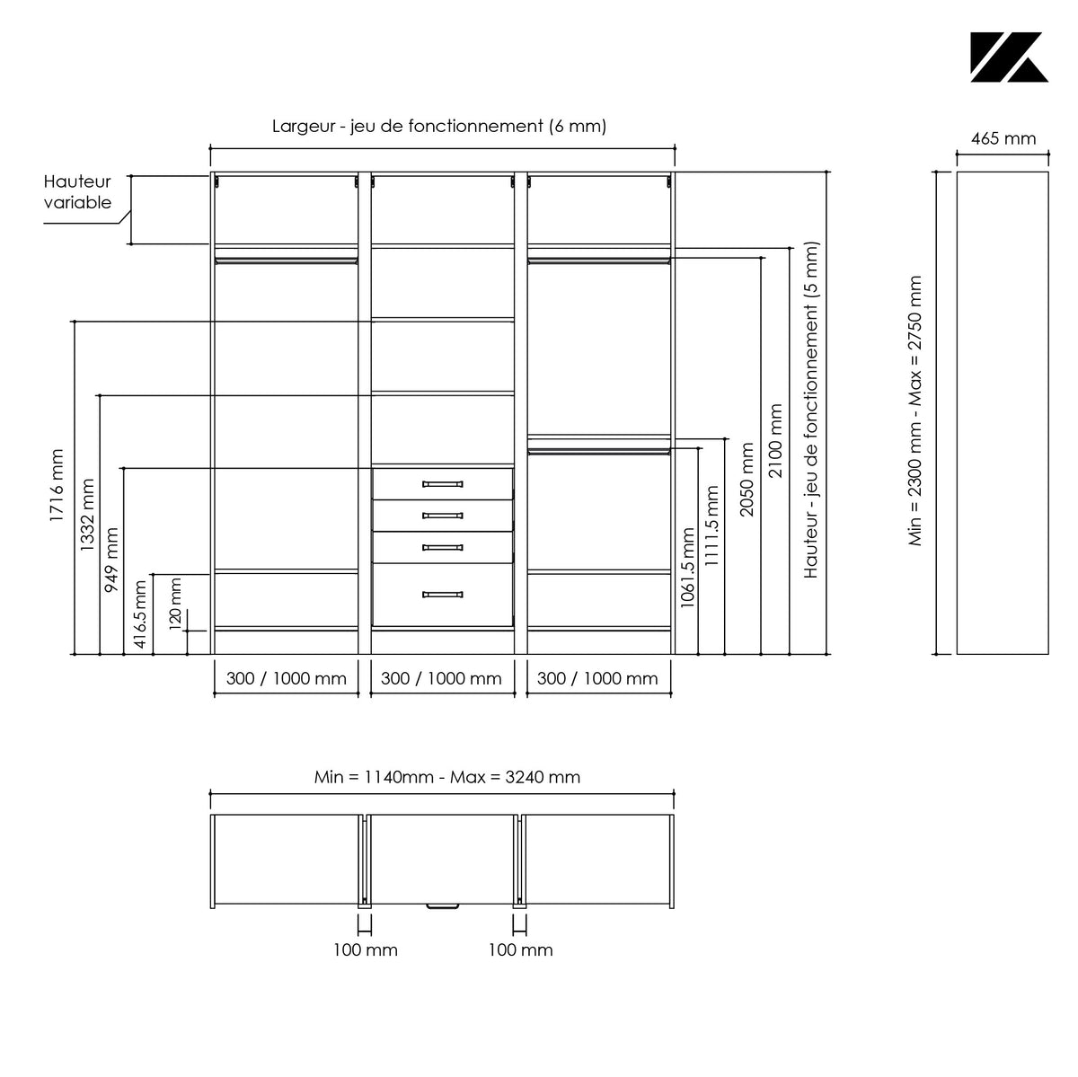 Dim. : H2500 mm x L2400 mm x P465 mm- Prix ordinaire