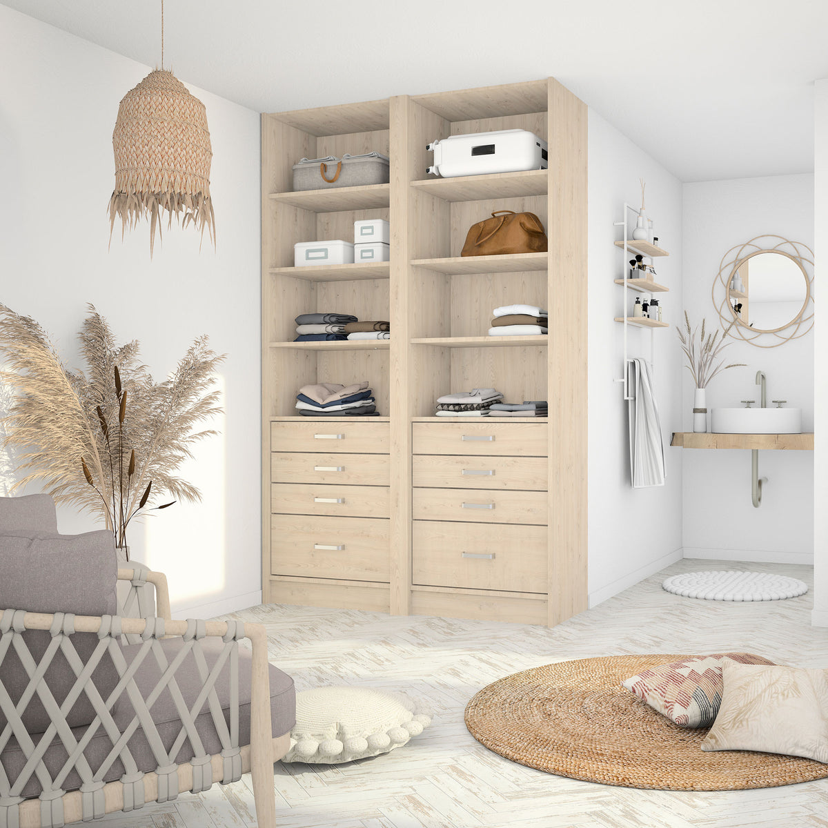 Ce dressing Châtaignier Clair de 2 espaces est composé () et de 8 étagères de rangement (idéales pour les vêtements pliés, comme les t-shirts et les pulls).