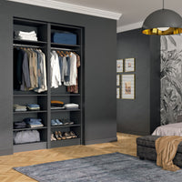 Ce dressing Graphite de 2 espaces est composé de deux tringles (2 penderies courtes pour les vêtements de type chemises, vestes) et de 8 étagères de rangement (idéales pour les vêtements pliés, comme les t-shirts et les pulls).