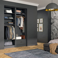 Ce dressing Graphite de 2 espaces est composé de deux tringles (1 penderie longue pour les robes et manteaux et 1 penderie courte pour les vêtements de type chemises, vestes), de 5 étagères de rangement (idéales pour les vêtements pliés, comme les t-shirts et les pulls), et d'un tiroir double (pour recevoir des objets volumineux comme les sous vêtements).