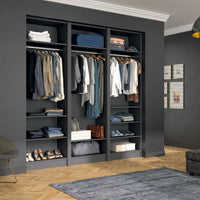 Ce dressing Graphite de 3 espaces est composé de trois tringles (1 penderie longue pour les robes et manteaux et 2 penderies courtes pour les vêtements de type chemises, vestes) et de 9 étagères de rangement (idéales pour les vêtements pliés, comme les t-shirts et les pulls).