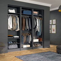 Ce dressing Graphite de 3 espaces est composé de quatre tringles (2 penderies longues pour les robes et manteaux et 2 penderies courtes pour les vêtements de type chemises, vestes) et de 7 étagères de rangement (idéales pour les vêtements pliés, comme les t-shirts et les pulls).