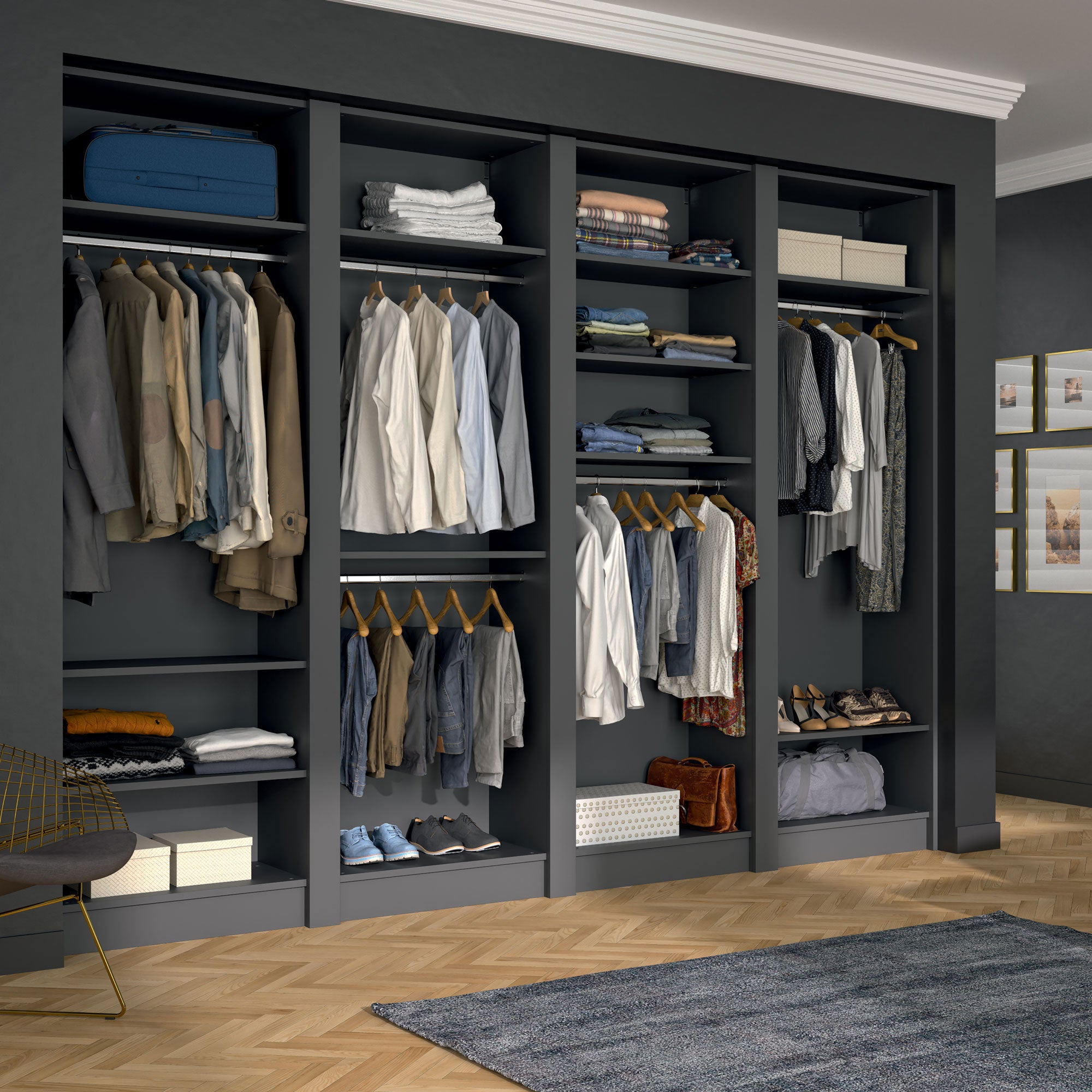 Ce dressing Graphite de 4 espaces est composé de cinq tringles (2 penderies longues pour les robes et manteaux et 3 penderies courtes pour les vêtements de type chemises, vestes) et de 10 étagères de rangement (idéales pour les vêtements pliés, comme les t-shirts et les pulls).