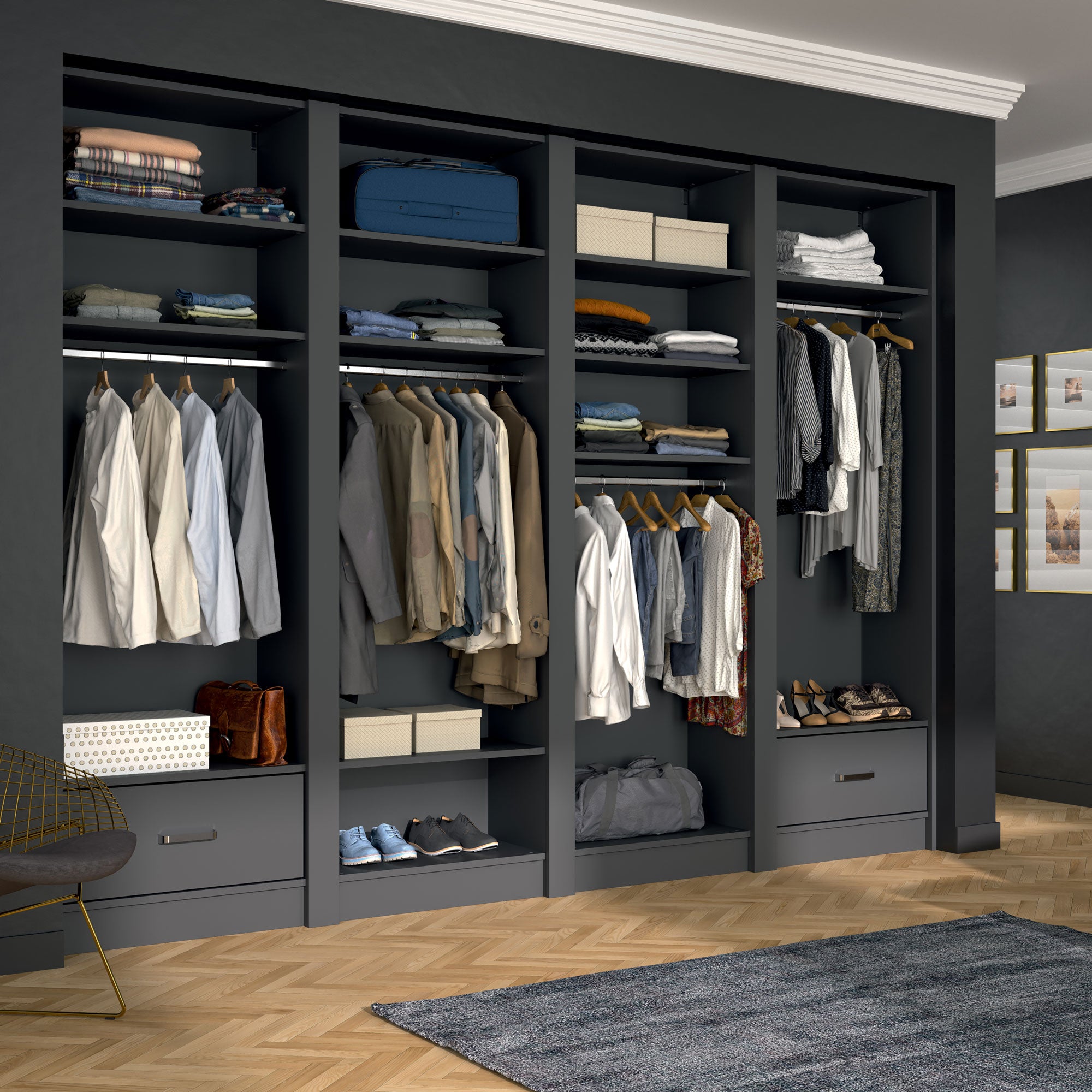 Ce dressing Graphite de 4 espaces est composé de quatre tringles (4 penderies courtes pour les vêtements de type chemises, vestes), de 11 étagères de rangement (idéales pour les vêtements pliés, comme les t-shirts et les pulls), et de deux tiroirs doubles (pour recevoir des objets volumineux comme les sous vêtements).