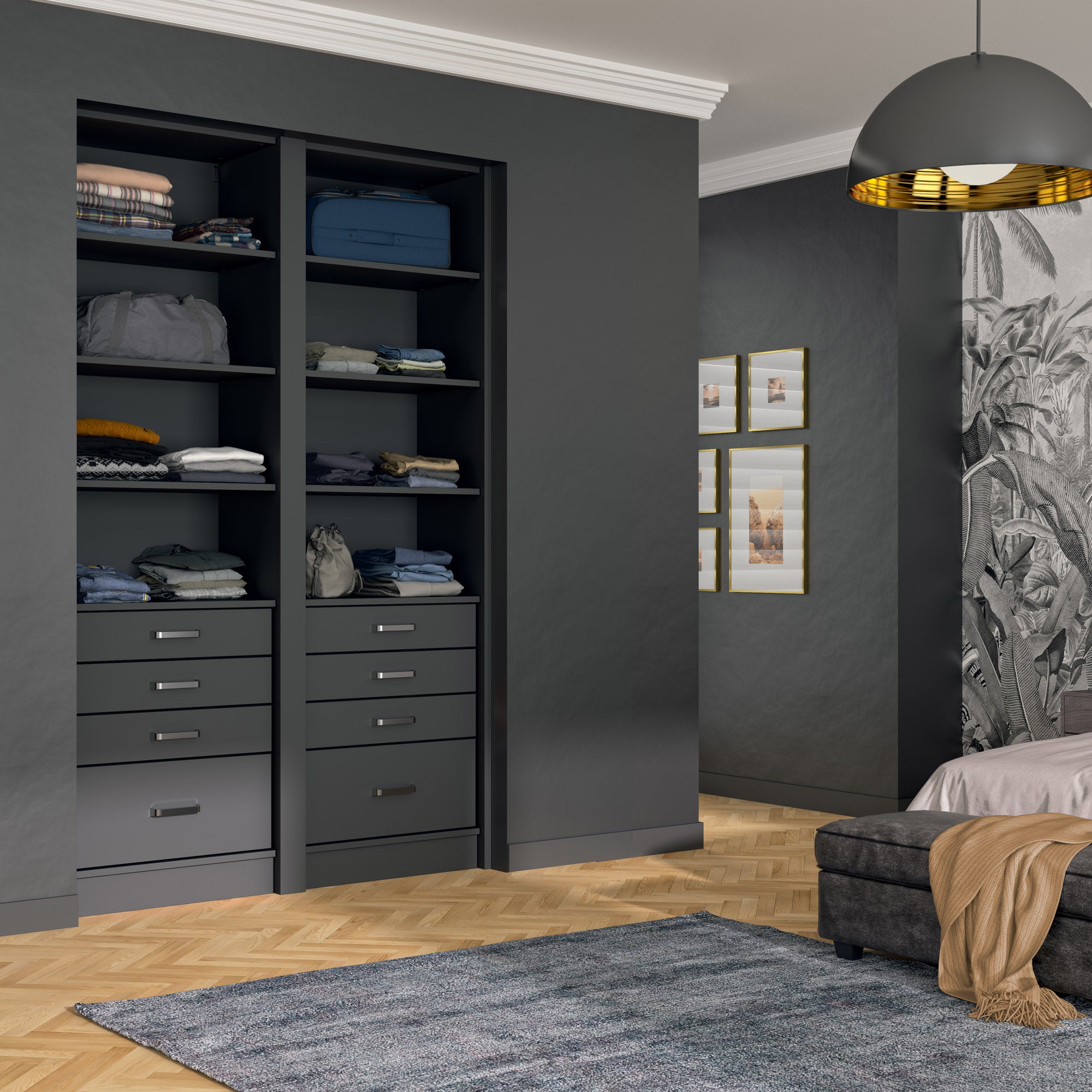 Ce dressing Graphite de 2 espaces est composé (), de 8 étagères de rangement (idéales pour les vêtements pliés, comme les t-shirts et les pulls), et de six tiroirs simples (pour accueillir les accessoires et les ceintures).