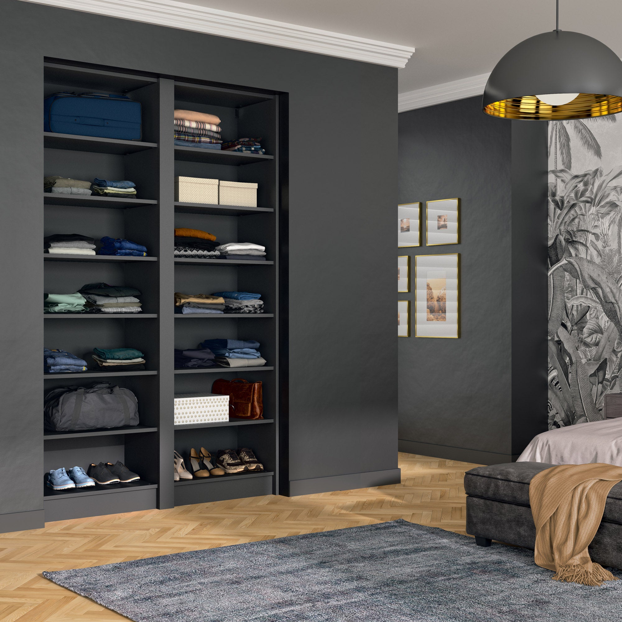 Ce dressing Graphite de 2 espaces est composé () et de 12 étagères de rangement (idéales pour les vêtements pliés, comme les t-shirts et les pulls).